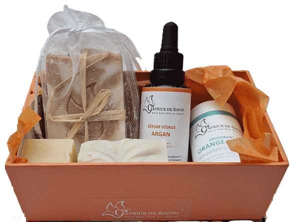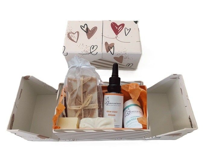 Coffret Visage Saint-Valentin comprenant 1 sérum visage ARGAN, 1 Déodorant solide Orange Douce 50ml et 1 Savon ABRICOT etc...