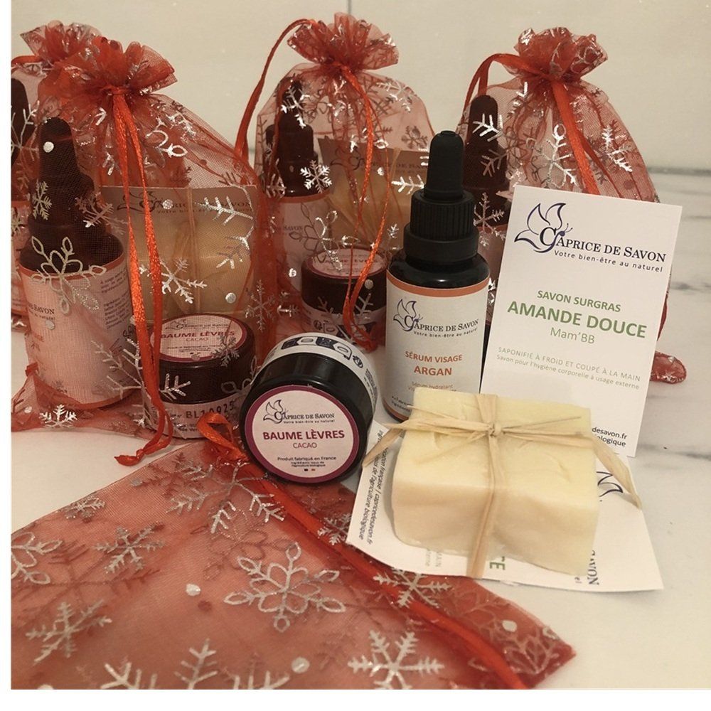 Lot Visage : 1 sérum ARGAN, 1 savon ABRICOT, et 1 baume lèvres CACAO avec sa pochette cadeaux offerte spéciale Noêl